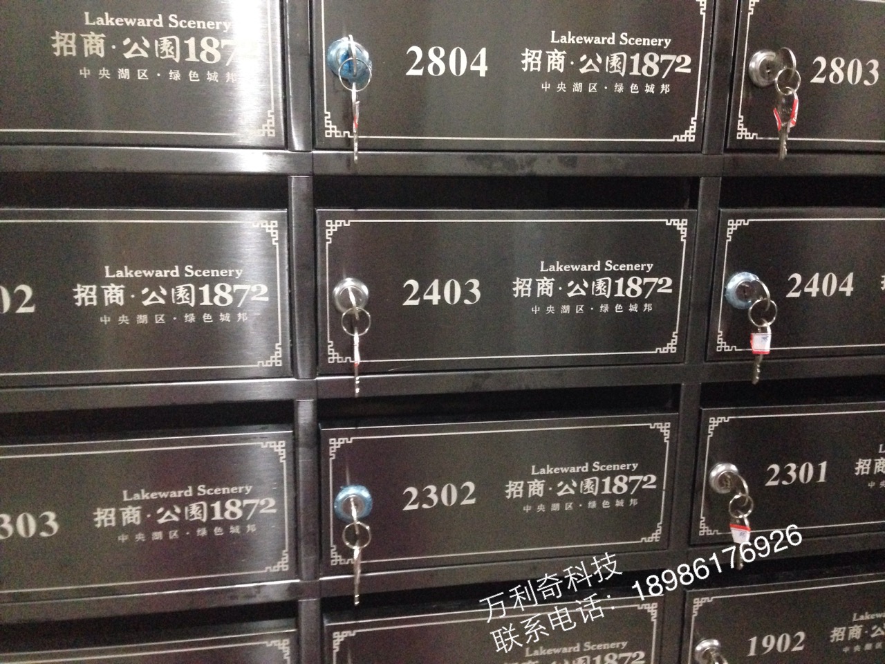 招商公园1872,座落于武汉3.4平方公里城市内湖南岸,是继北京招商公园1872成功打造后,进入华中区的公园的作品,城市滨湖社区。万利奇制作的招商公园1872信报箱招商公园1872信报箱,采用的是门板为黑钛不锈钢,周边、横竖隔条全为黑钛不锈钢。整个箱体给人的感觉大气、上档次!